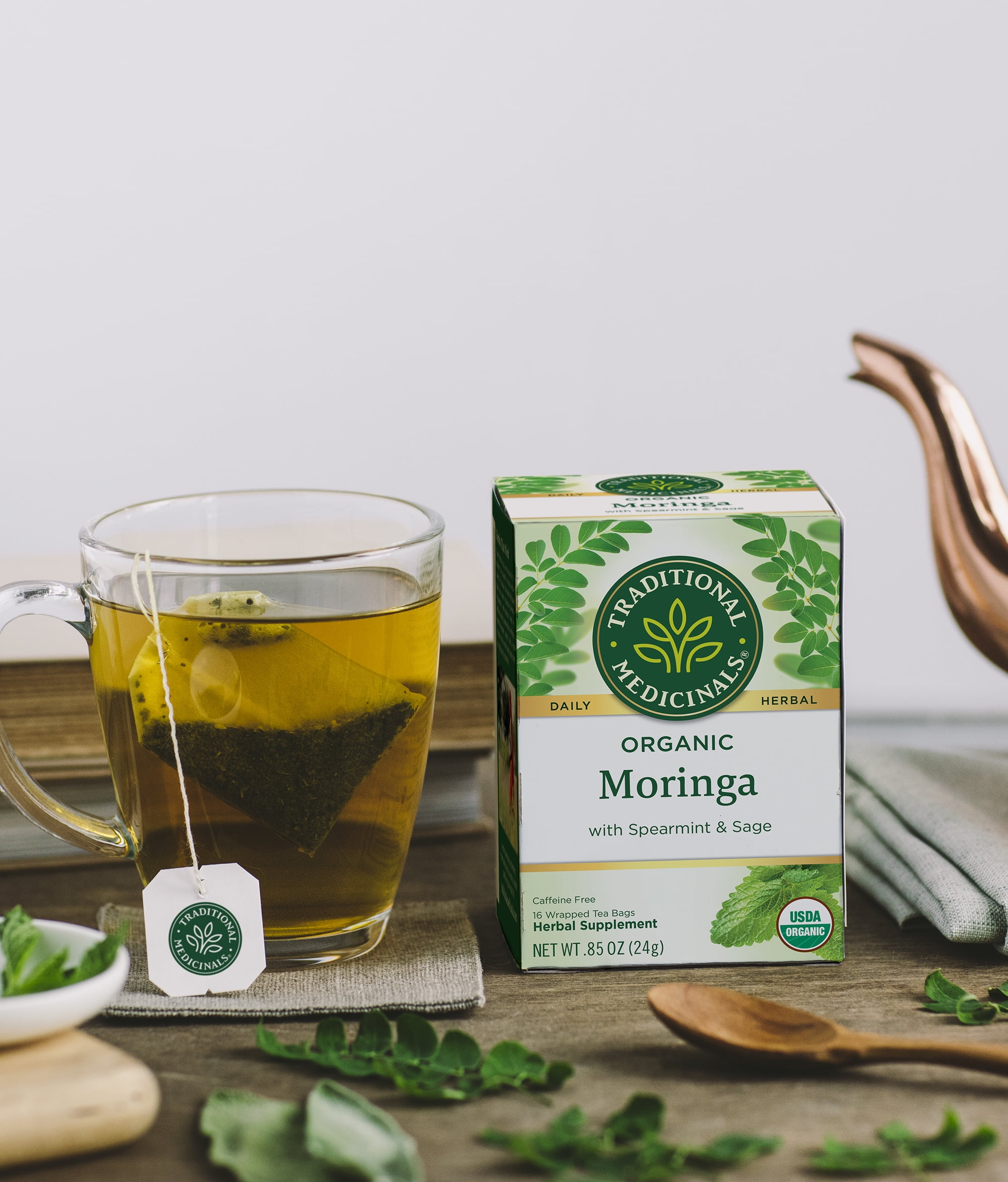 Looking to boost your overall health and wellness and mix in a new tea? Look no further than Traditional Medicinals Moringa Tea. For over 3,000 years, ayurvedic healers have relied on the nutrient-packed moringa plant, also known as "the Miracle Tree." This tea combines moringa with sage and spearmint for a refreshing, minty flavor that's perfect for daily support. With earthy and floral notes, this caffeine-free tea offers a wise, balanced, and refreshing personality, while contributing to a healthier you. Try Traditional Medicinals Moringa Tea today!